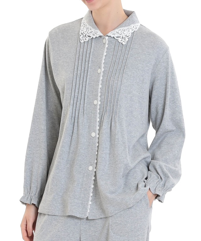 ナルエーより肌触りのしっとりコットンスムース素材のパジャマが届きました♪ サイズはM-Lのワンサイズ。 カラーはグレーです。(襟レースはオフホワイト) 襟が素敵なカッティレースをあしらった上品なパジャマ✨ 誰からも喜んで頂けるデザインと素材です。 肌触りが優しいコットン100%のスムース素材。 コットンスムースは裏表がなく、滑らかな肌触りと弾力のある適度な厚み、生地特有の伸縮性が特徴で、 吸湿・吸水性に優れています。 シンプルながらもこだわりのレースでお顔周りが華やぎます。 胸元に入れたピンタックで気になるバストラインをカバーします。 トップスの着丈は通常より長めで安心感があります。 パンツの裾にはゴム入りです。(調整可能なゴム穴あり)