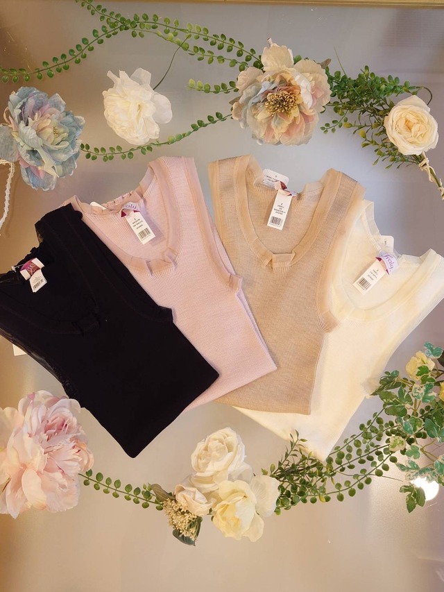 フラリー(イタリアブランド:fraly) より人気の肩ひもがチュール生地で施されたコットンリブキャミが入荷♪ 柔らかな伸縮性の高い生地はもとより、このチュールヒモなら春夏のお洋服で見えても良い感じです♪ 毎回多くのお客様からヘビロテアイテムになるッ♪とお声をいただきます♪ まだお試しになったことがない方はぜひぜひ こちらのシリーズは コットン100%と シルクウールタイプ の2種類があります♪ カラーによって違いますので下の欄をご覧くださいませ✨ ●フラリーチュール紐コットンリブキャミ ●素材 綿100% ●プライス 8,250円税込 ●ローズピンク Lサイズ サックスブルー Sサイズ ブラック LLサイズ ●フラリーチュール紐シルクウールリブキャミ ●素材 シルク15%、ウール85% ●プライス 9,900円税込 ●ルビー Lサイズ ユーログレー Lサイズ