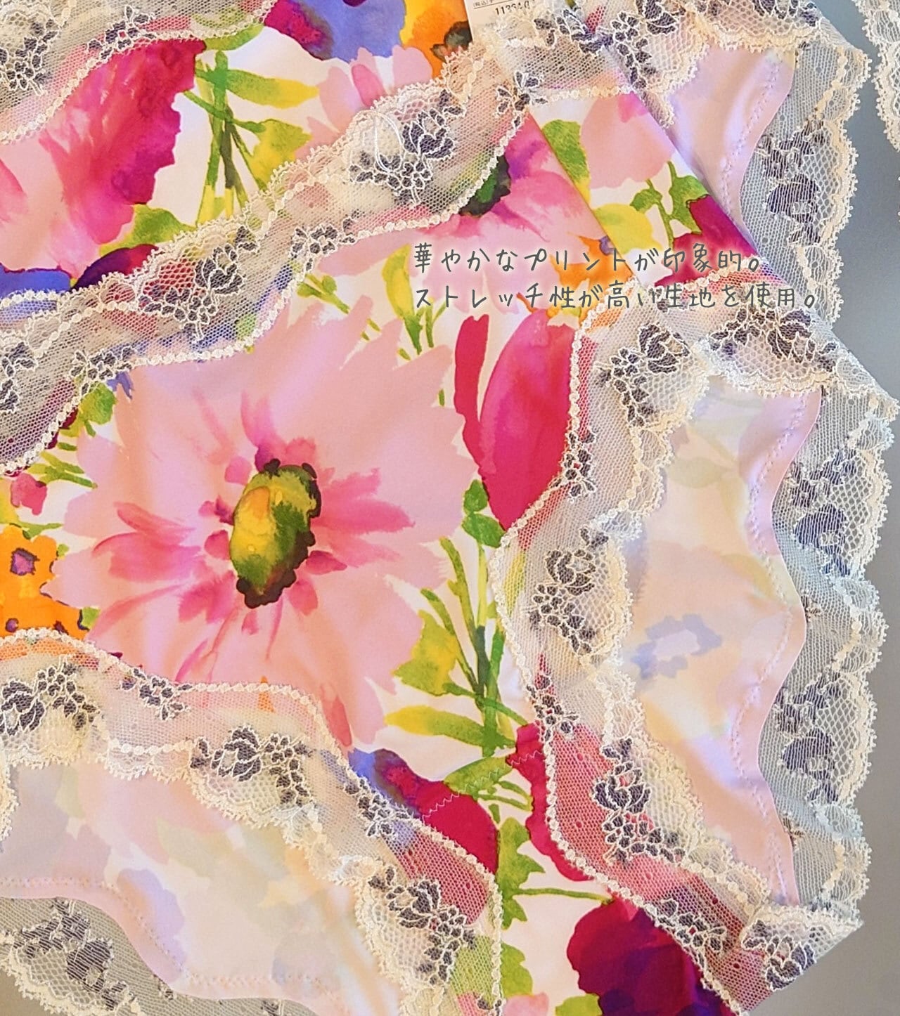 目にも鮮やかな大胆な花柄が特徴のスッポリショーツ。
