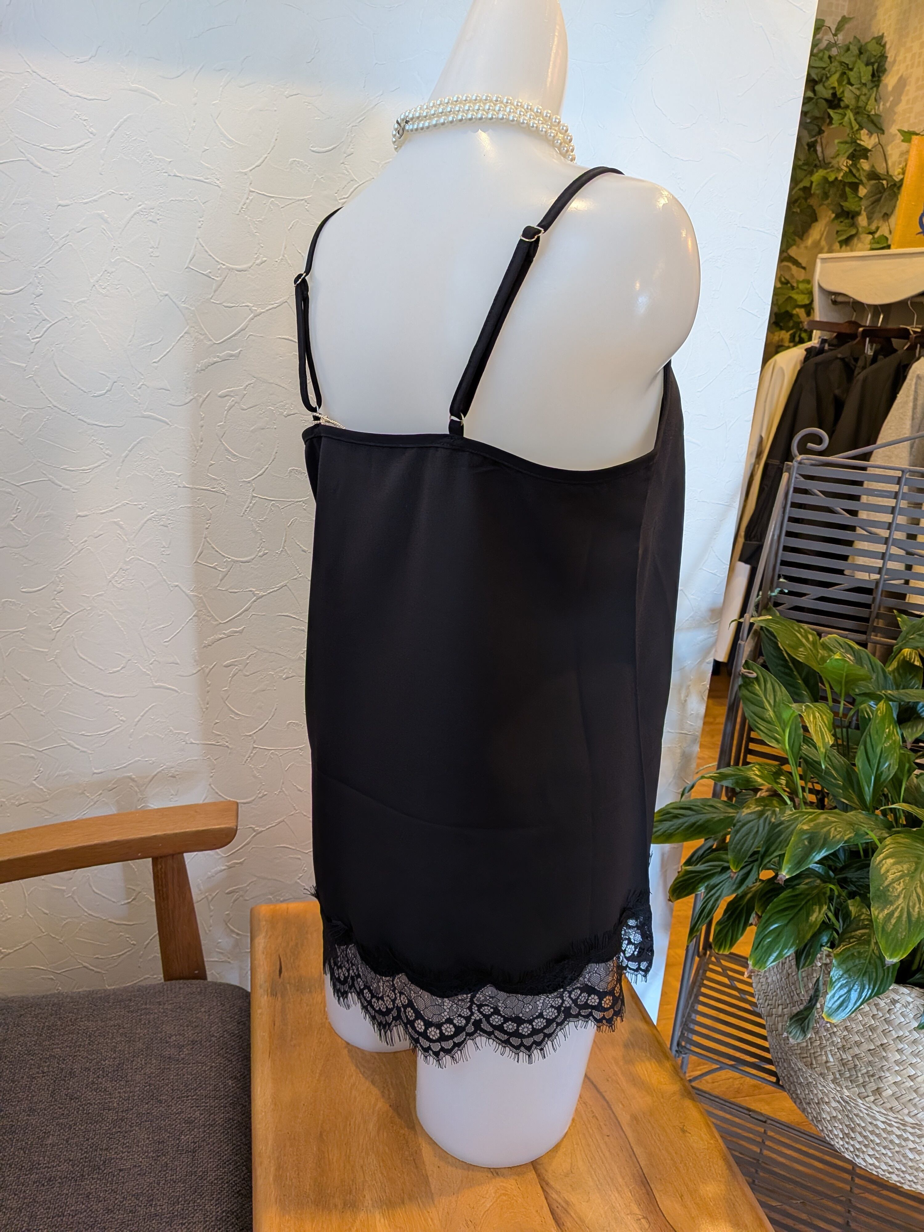 斜め裁断の裾がセクシーなミニスリップ。見せキャミとしてお洋服でも活用できます♪