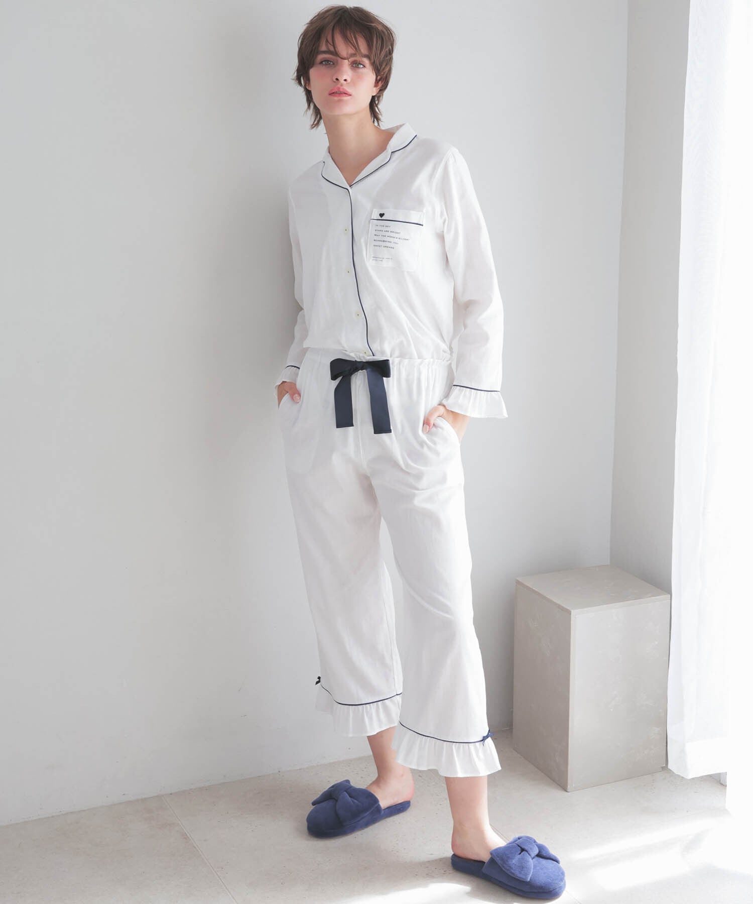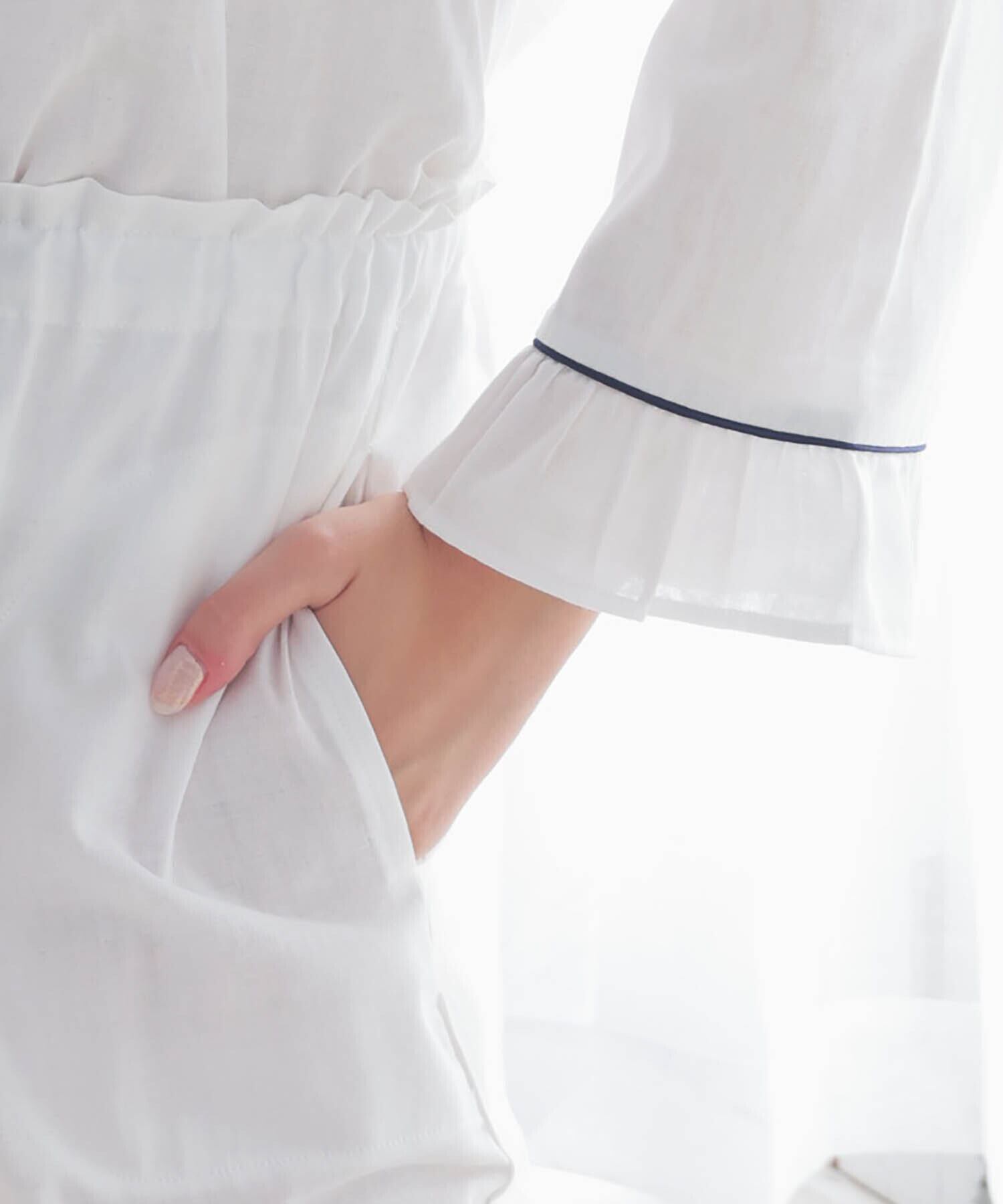 袖口、パンツ裾のフリルとウエストリボンでガーリーな仕上がりに。