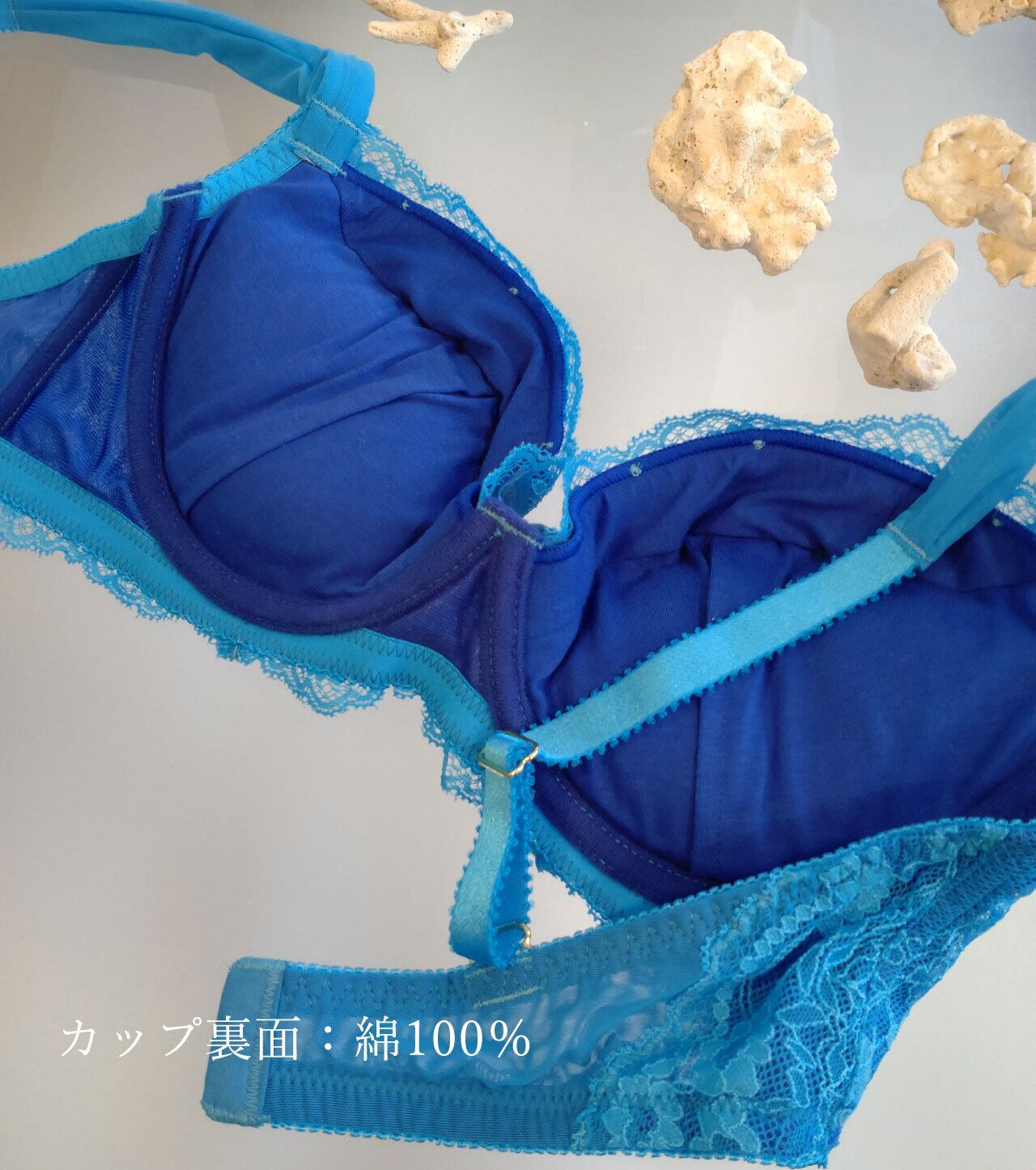 海の青のような濃いベースにシアンブルーのレース。その組み合わせは目を奪われるような華やかさ。レースのカッティングも綺麗なので美しい仕上がりになっています。